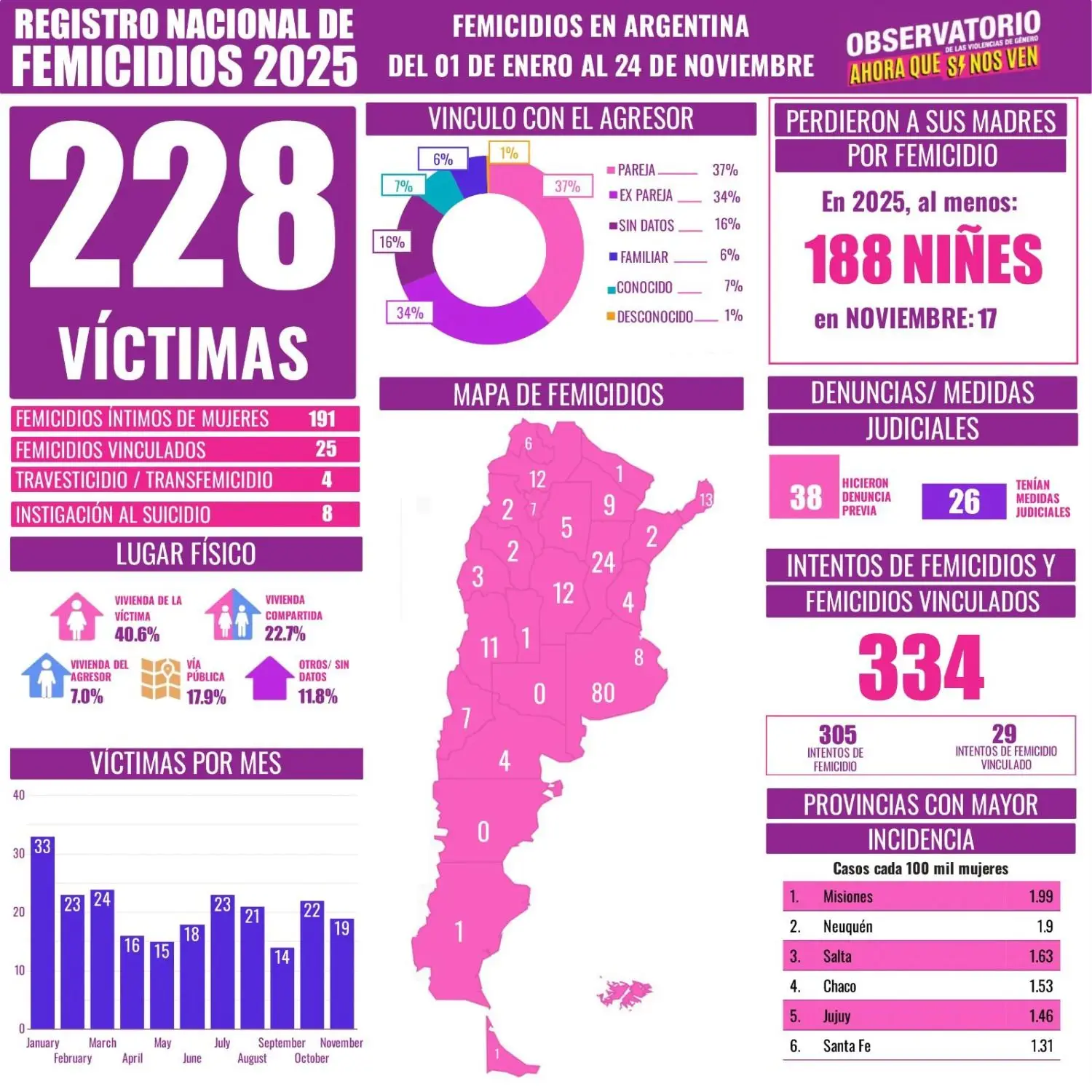 Este 2025 contó también con 334 intentos de femicidio e intentos de femicidios vinculados, de lo cual se desprende que hubo un intento de femicidio cada 26 horas en el país. Por su parte, al menos 188 niñas y niños se quedaron sin sus madres producto de actos vinculados con la violencia machista.