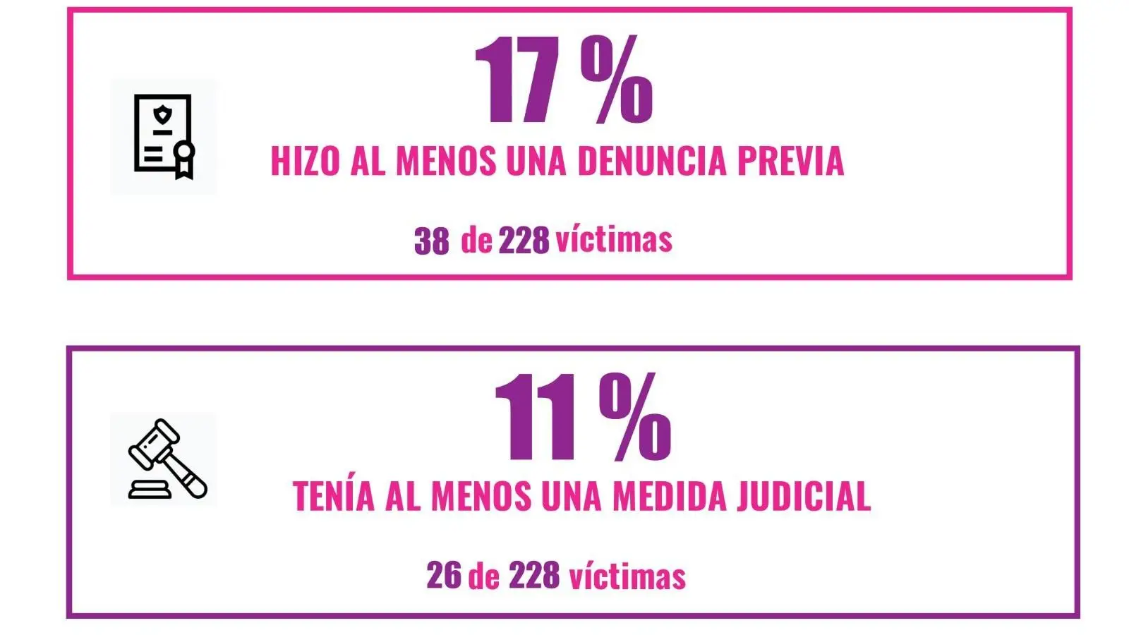 De los 228 femicidios registrados en lo que va del año, se corroboró que en un 17% de los casos, las víctimas habían realizado una denuncia previa. A su vez, en un 11% de los ataques se registraba al menos una medida judicial realizada sobre el agresor. Sin embargo, estas medidas no lograron su función y terminaron siendo ineficaces a la hora de impedir que se perpetraran los femicidios anunciados en el informe.