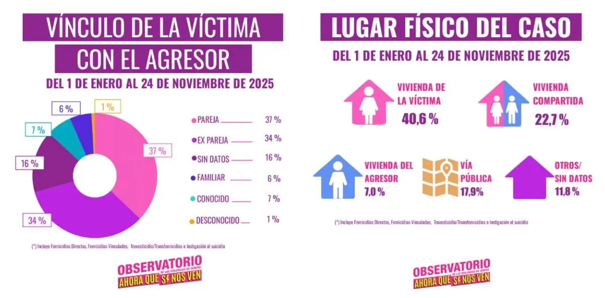 Al mismo tiempo, el lugar físico que más se repitió para la realización de los ataques fue la vivienda de la víctima, siendo el escenario del crimen en un 40,6% de los casos, mientras que la vivienda compartida de la víctima y su agresor ocupa el segundo lugar siendo parte del hecho violento en el 22,7% de los casos.